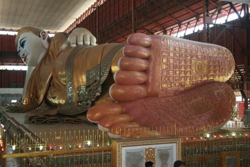 Weiter zur Kyauk-htat-gyi-Pagode mit einem 70 Meter langen liegenden Buddha, der in einer riesigen Halle untergebracht ist. Und dann noch ein Abstecher zum sitzenden Buddha, angeblich mit mehr als 100 Kilo Blattgold verziert. So jedenfalls habe ich Thet verstanden, der inzwischen zum Reiseführer avanciert ist.