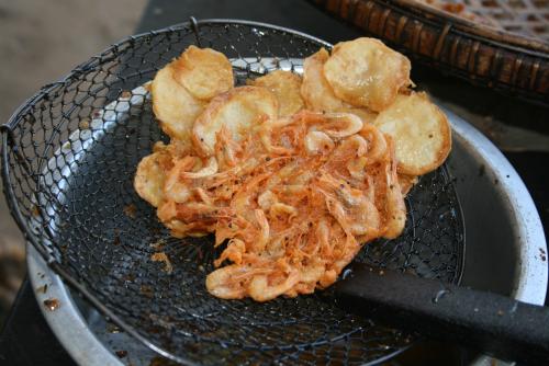 Jetzt möchte ich weiter nach Inwa und schnappe mir ein Taxi, das im Schatten eines großen Mangobaums wartet. An einer der kleinen Garküchen werden gerade Shrimpskuchen gebacken. Mit Schalen, Kopf und Schwanz versteht sich. Der Magen knurrt. Ich kann nicht widerstehen und teste einen. Das Zeug schmeckt teuflisch gut. Insbesondere nachdem es mit scharfer Sauce nachbehandelt wurde.
