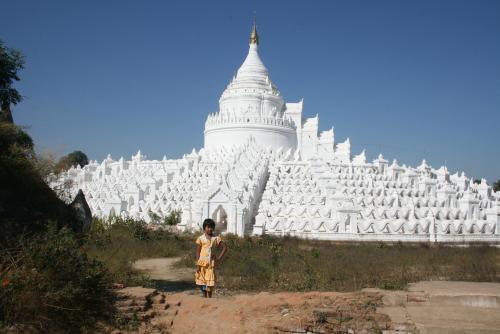 Ich mache mich auf die Suche nach der weißen Hsin-byu-me-Pagode. Sie symbolisiert den Weltberg Meru aus der indischen Mythologie und soll sich deutlich von allen bislang besuchten Pagoden unterscheiden. Woher ich das weiß? In der Schule war Erdkunde mein Lieblingsfach! Letzteres stimmt - der Rest ist im Reiseführer geklaut. Was ich dort allerdings nicht finden kann, ist die exakte Wegbeschreibung. Statt an der Pagode lande ich in irgendwelchen Hinterhöfen. Plötzlich steht ein kleines Mädchen neben mir. "White pagoda this way Sir..." sagt sie in fast perfektem Englisch und deutet mir einen anderen Weg. Anschließend weicht sie nicht mehr von meiner Seite. Am Anfang zweifle ich noch, ob der Weg wirklich zum Ziel führt. Aber die Kleine kennt sich aus. Wir nähern uns der Pagode über einen Trampelpfad von der Seite.