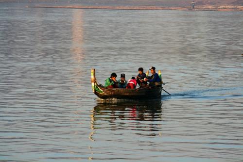 Er fließt in einer breiten Tiefebene zwischen zwei Gebirgszügen, die im Osten die Grenze zu Thailand und im Westen zu Bangladesch markieren. Bis zum gigantischen Mündungsdelta sind es noch an die 600 km - bei einer Höhen Differenz von gerade mal 60 Metern. Während der Trockenzeit ist der Wasserstand niedrig. Unser Kahn schippert kreuz und quer über den Fluss. Immer wieder stochern zwei Bootsjungen mit Bambus-Stangen im Wasser. Ich frage den Käpt'n wieviel Tiefgang wir haben. "5 Feet", sagt er. Und wie tief ist es hier? "5 Feet...!" Dass er nicht übertrieben hat merke ich eine Weile später, als wir Grundkontakt haben und im Kreis fahren müssen, um frei zu kommen.