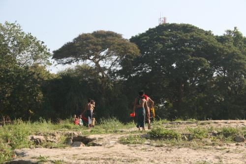Was auffällt ist, das jeder Quadratmeter des Ufers bepflanzt ist - mit Süßkartoffeln und Mais - und auf den letzten Metern vor dem Fluss mit Reis. Das Zeug muss bis Mai geerntet sein, weil der Pegel während der Regenzeit massiv ansteigt.
