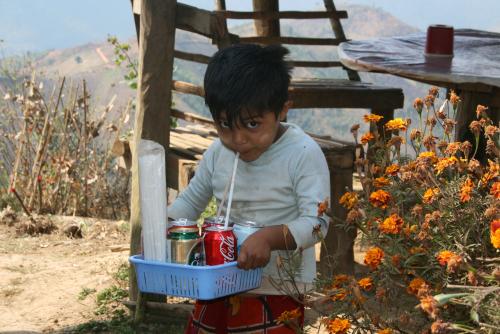 Hier gibt es ein paar Hütten und etwas, das wie ein Restaurant aussieht. Zum Lunch gibt es Avocado-Suppe und Pfannkuchen mit einer undefinierbaren, gelben Gemüsemischung. Wer Hunger hat fragt nicht und genießt. Dazu noch eine frische Avocado, die mit etwas Salz vorzüglich schmeckt. Als wir aufbrechen, "erwische" ich den Sohn des Hauses dabei, wie er beim Tisch abdecken leere Cola-Dosen aussaugt.